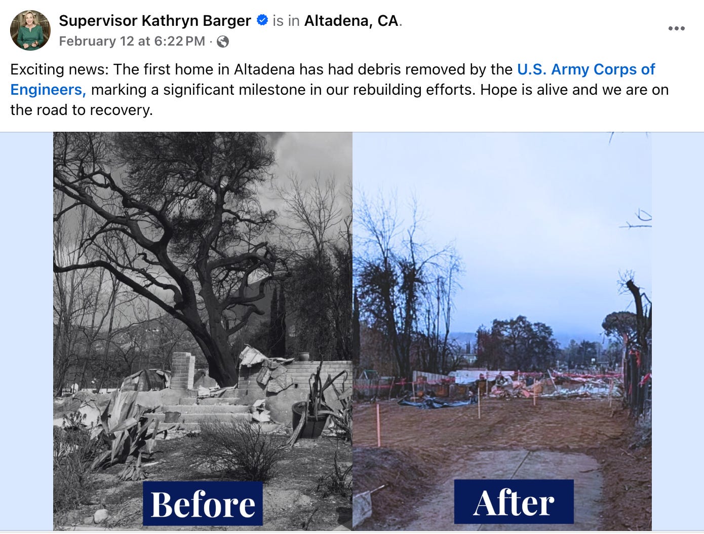 Our county supervisor (Altadena is unincorporated and does not have a mayor) shared the above before-and-after photos of a lot that cleared Phase 2 and is ready for rebuilding. A comment on the post reads, “And thousands more to go. Clearing one lot doesn’t excite me very much.” So now, we wait, some of us more prudently than others.