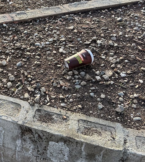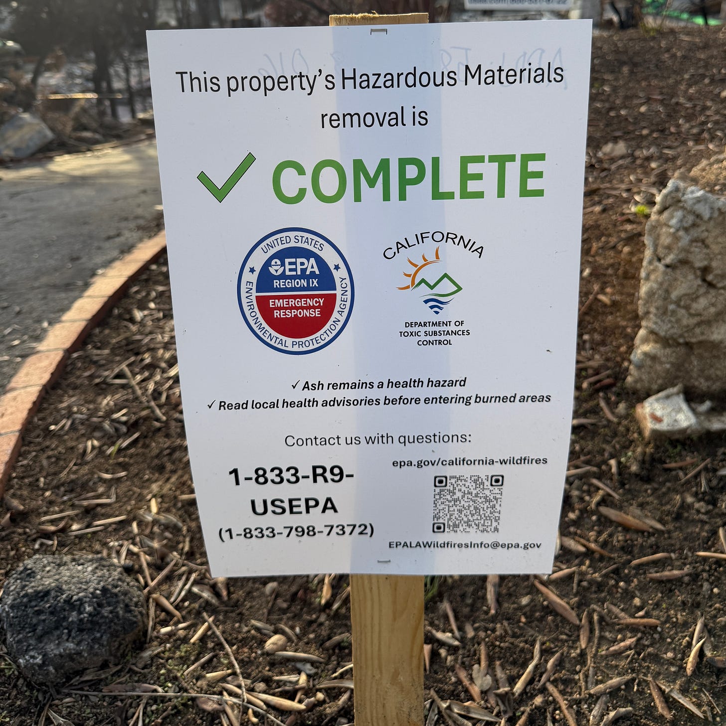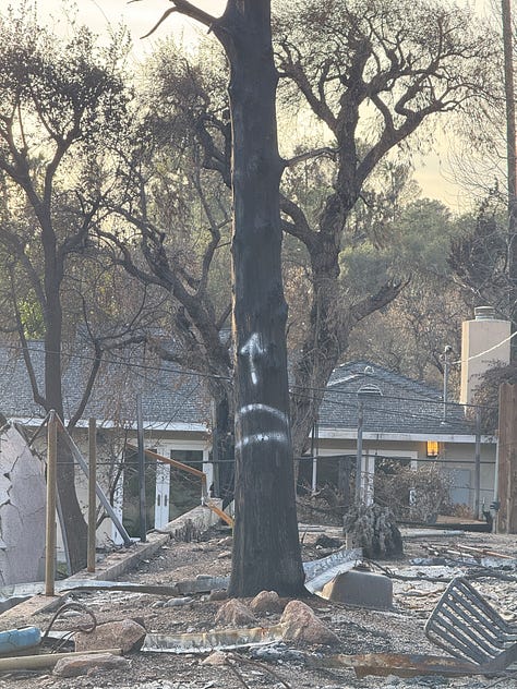 Phase 1 is now complete for my neighborhood, which would be obvious even if we didn’t track progress using the SoCal Fires 2025 - Parcel Status LookUp map. Every time we visit “the crater,” as we now call our former home, there’s new evidence of disruption: charred paint cans dug up by the EPA. Strange hieroglyphics mark our blackened trees from county arborists labeling dead growth. We noticed a gas station coffee cup and empty water bottles perched on a retaining wall, because when the entire town is trash, it doesn’t matter where you leave your actual garbage.